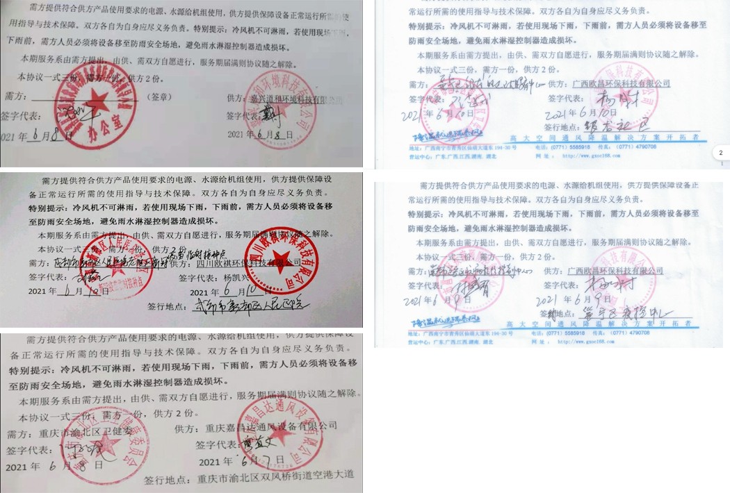 另,兩日來(lái)繼續(xù)簽下服務(wù)項(xiàng)目的瑞泰風(fēng)愛(ài)心代表團(tuán)隊(duì)有:四川歐祺環(huán)保科技有限公司、廣西歐昌環(huán)保科技有限公司、湖北瑞兆偉業(yè)通風(fēng)降溫科技有限公司、嘉興道和環(huán)境科技有限公司,其中歐祺、歐昌再次收獲多項(xiàng)服務(wù)機(jī)會(huì)。再次熱烈祝賀重慶嘉昌達(dá)通風(fēng)設(shè)備有限公司,祝賀以上各家瑞泰風(fēng)愛(ài)心團(tuán)隊(duì)!